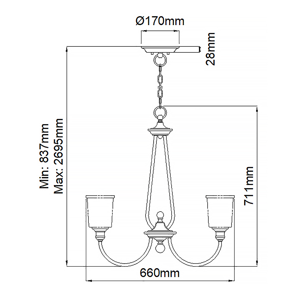 3 лампы - мин. длина - 71.7 см, макс. длина - 257.5 см. (Д56 х В59.1 см) Вес 4.64 кг
